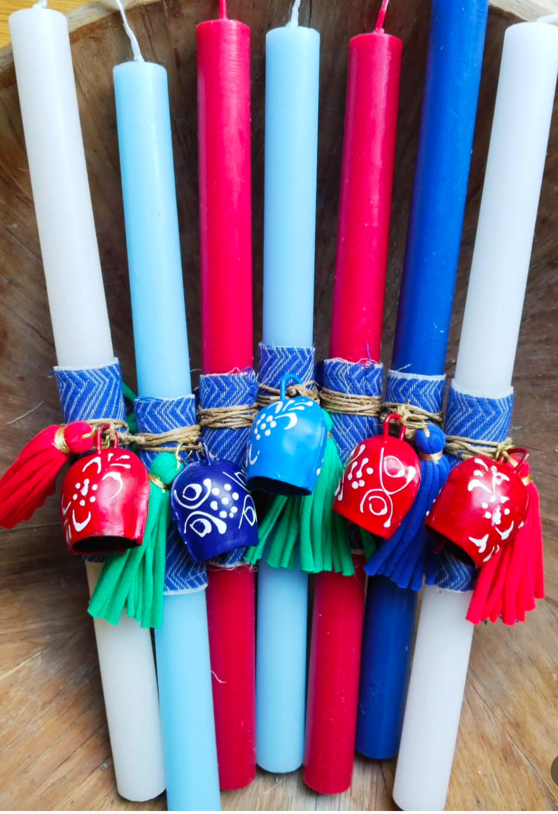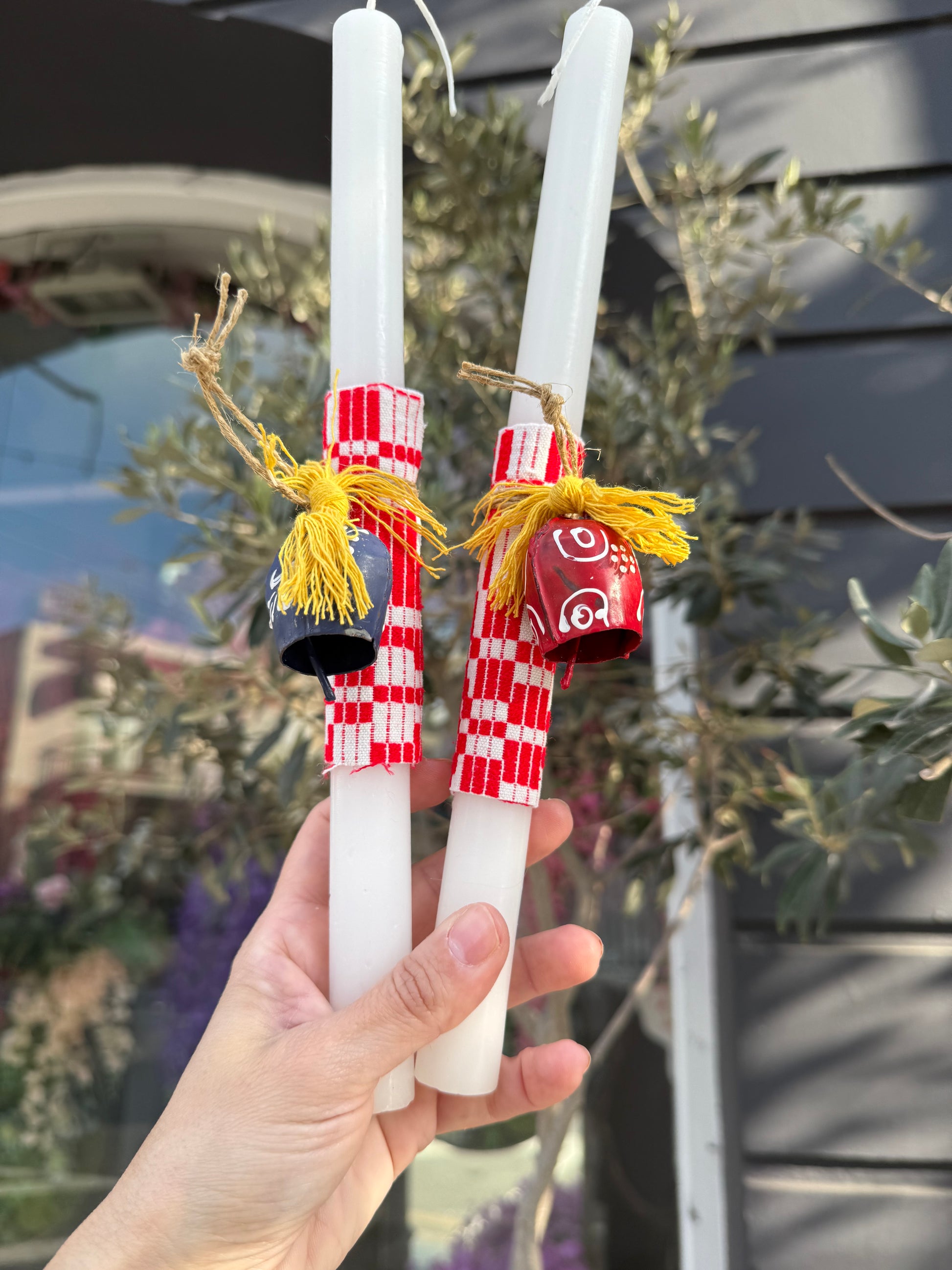 Λευκή λαμπάδα με παραδοσιακό ζωγραφιστό κουδουνάκι. White Easter candle with traditional bell.